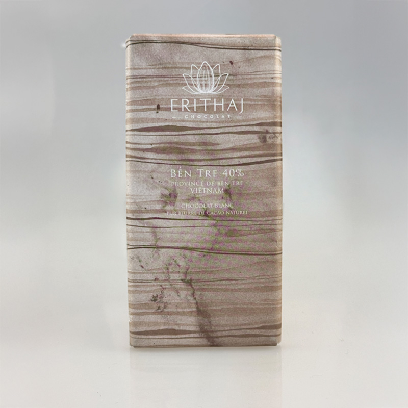 Ce chocolat blanc est confectionné à partir de beurre de cacao d’origine, pressé par nos soins.